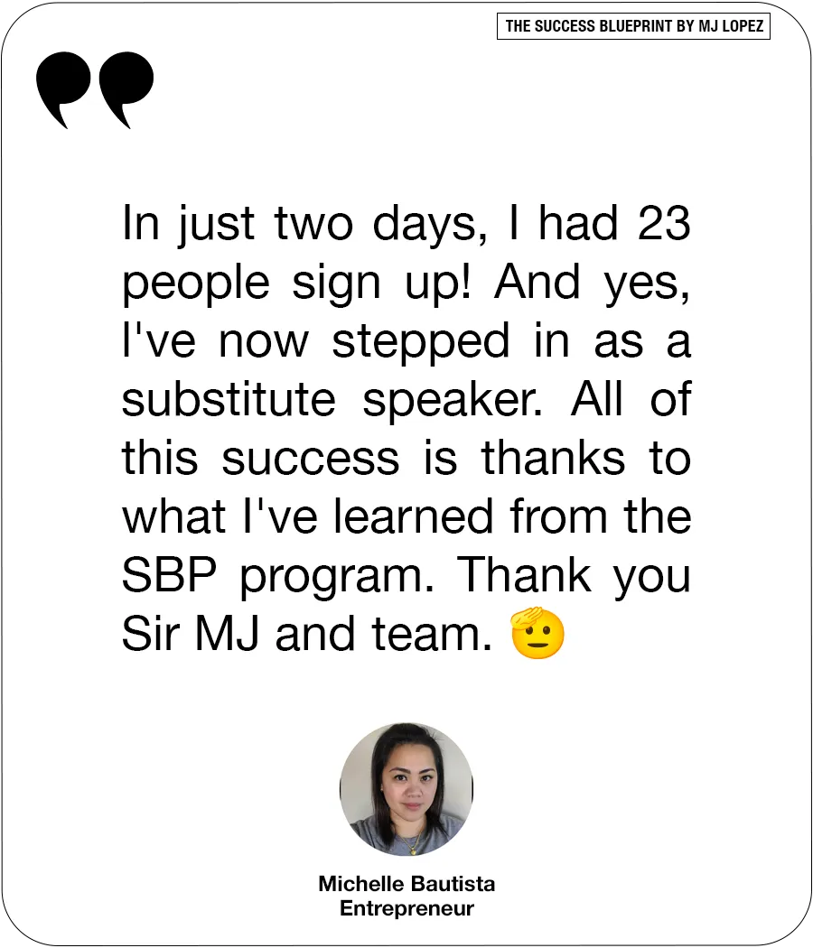 MJ Lopez will be hosting exclusive events and only the students of The Success Blueprint will be allowed to join. This way you will get to connect with me and students who are aligned with the our vision as a community. We will also have transformational events, workshops, seminars, mastermind, and live coaching sessions.