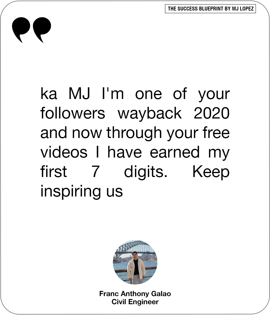 Get access to the monthly live call session with MJ Lopez. This is where you can ask questions and MJ Lopez will answer you live! He will also process all the learnings and utilize all the knowledge for you to understand all the lessons better. This is one of the biggest bonuses you will get from the Success Blueprint Course.